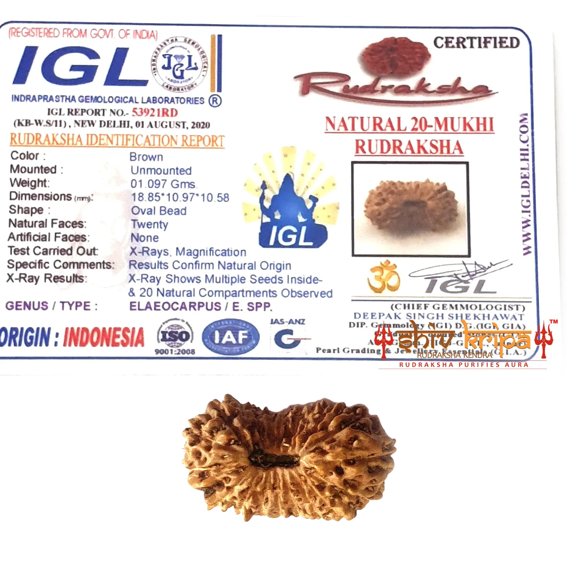 The Natural 20-Mukhi Rudraksha Indonesia is a rare and sacred spiritual bead revered for its powerful connection to divine energies. Originating from Indonesia, this bead features twenty natural faces and no artificial modifications.