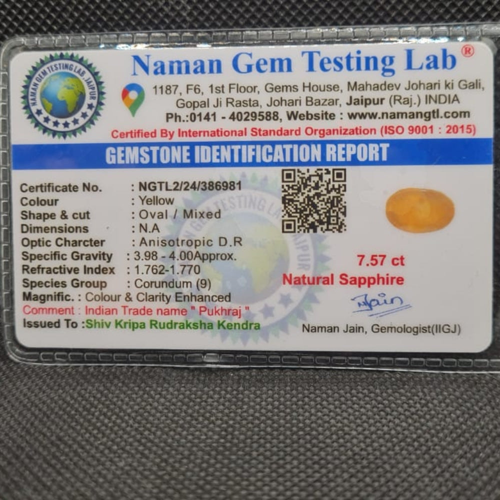 The Natural Yellow Sapphire (Pukhraj) is a certified gemstone admired for its bright yellow color and strong astrological significance. Highly valued in Vedic astrology, Pukhraj is associated with wisdom, prosperity, success, and divine blessings.