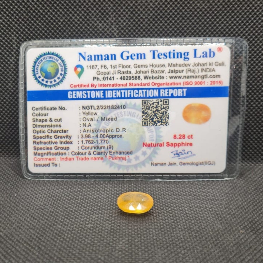 The Natural Yellow Sapphire (Pukhraj) is a certified gemstone admired for its bright yellow color and strong astrological significance. Highly valued in Vedic astrology, Pukhraj is associated with wisdom, prosperity, success, and divine blessings.