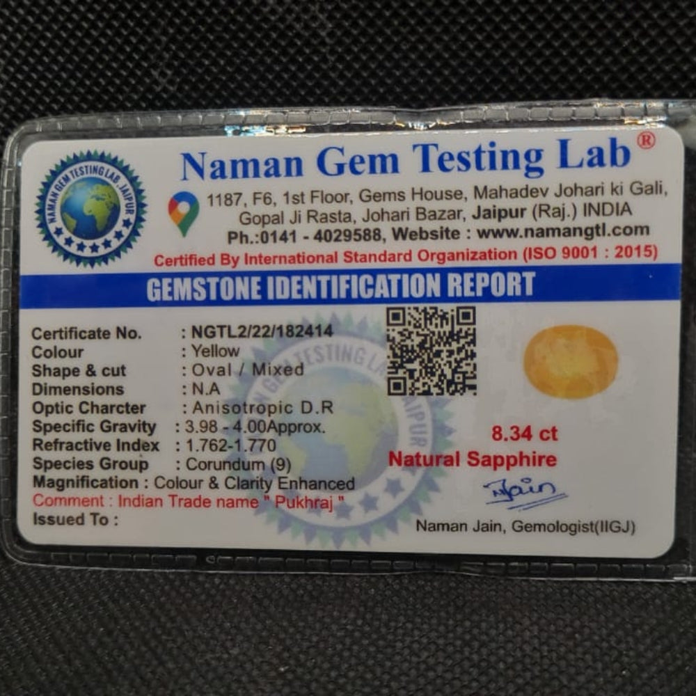 The Natural Yellow Sapphire (Pukhraj) is a certified gemstone admired for its bright yellow color and strong astrological significance. Highly valued in Vedic astrology, Pukhraj is associated with wisdom, prosperity, success, and divine blessings.